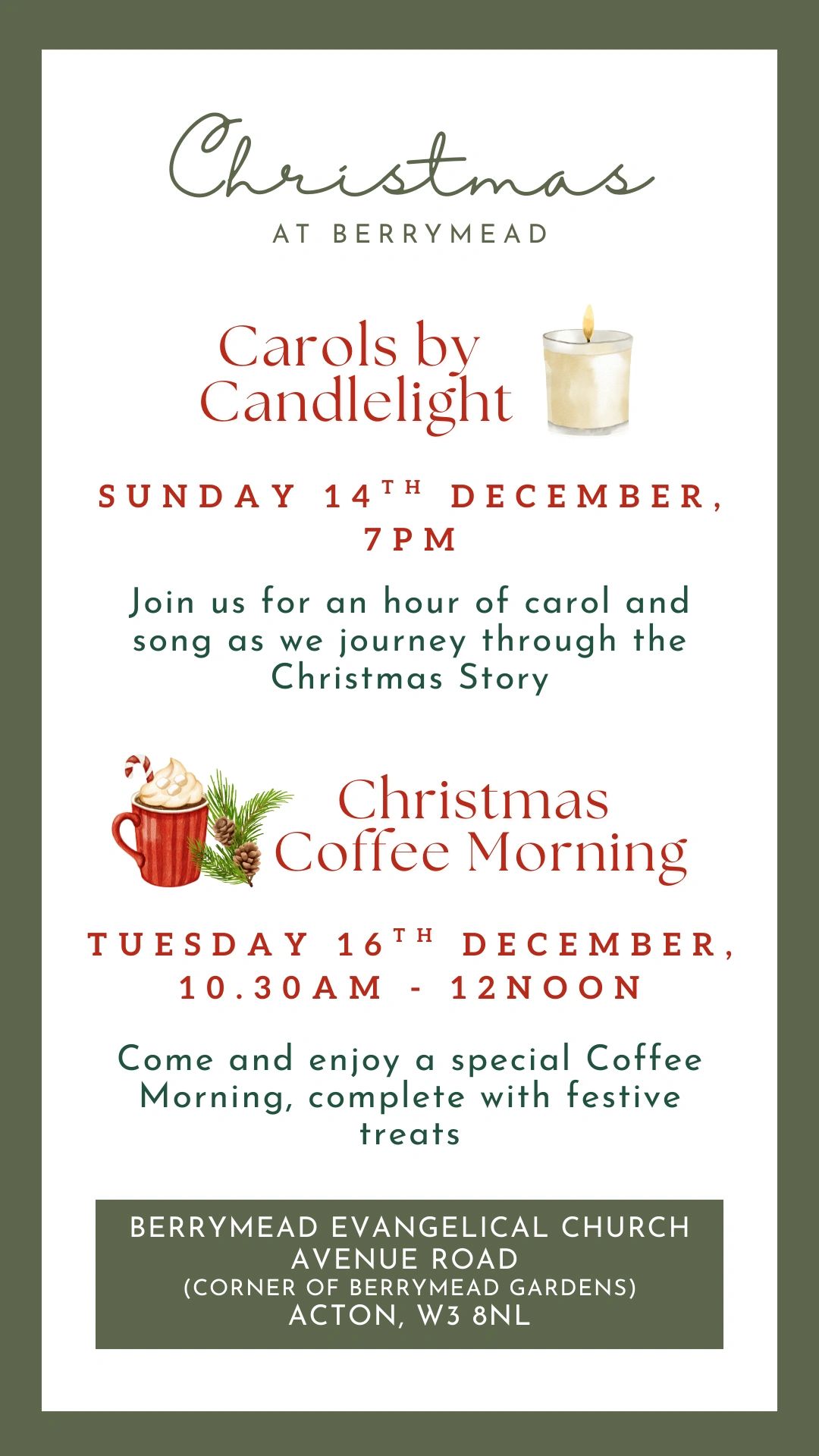 We invite you to our annual carol event! Come and hear the Christmas Story and enjoy the music and carol singing. Refreshments to follow.